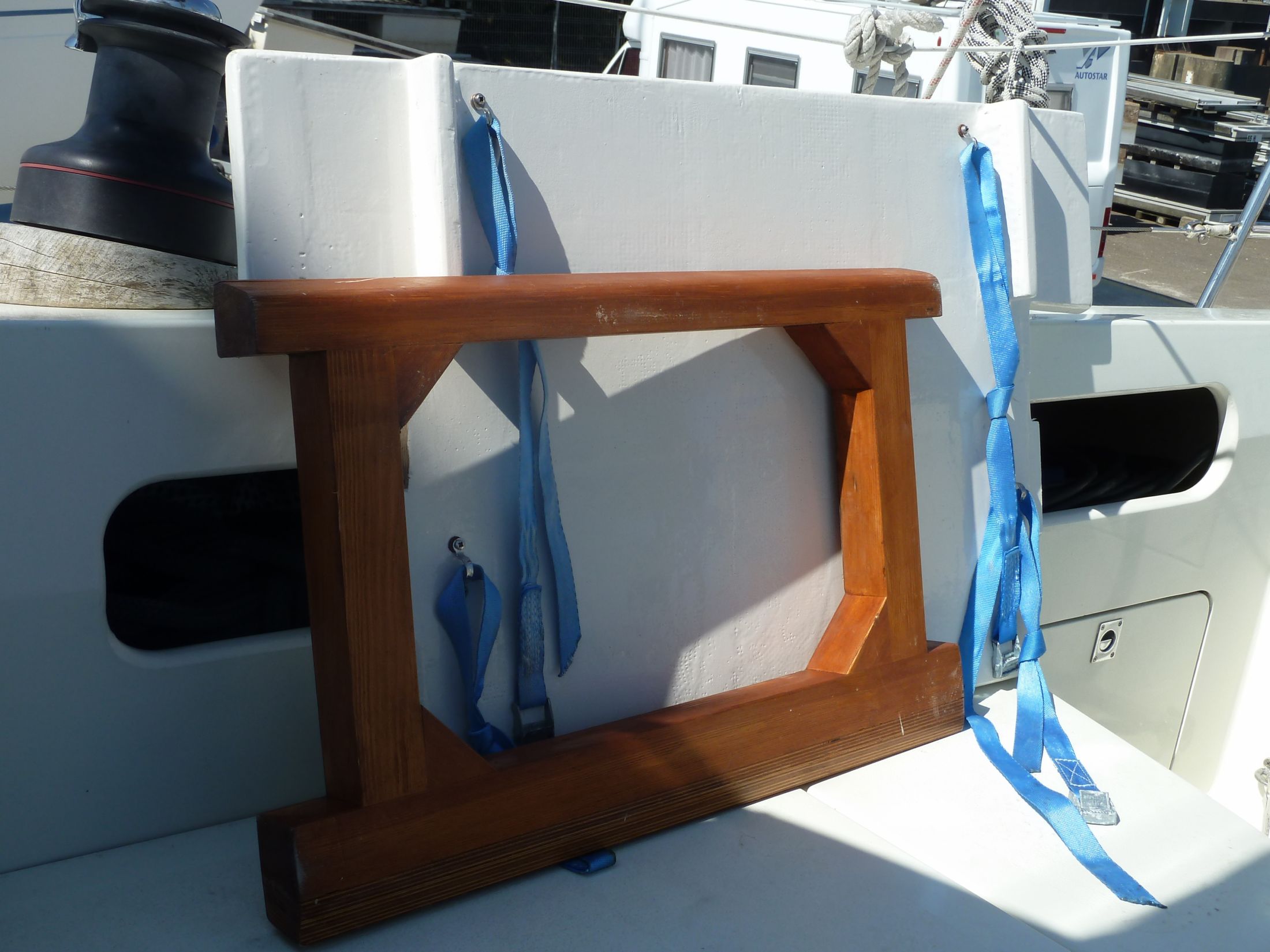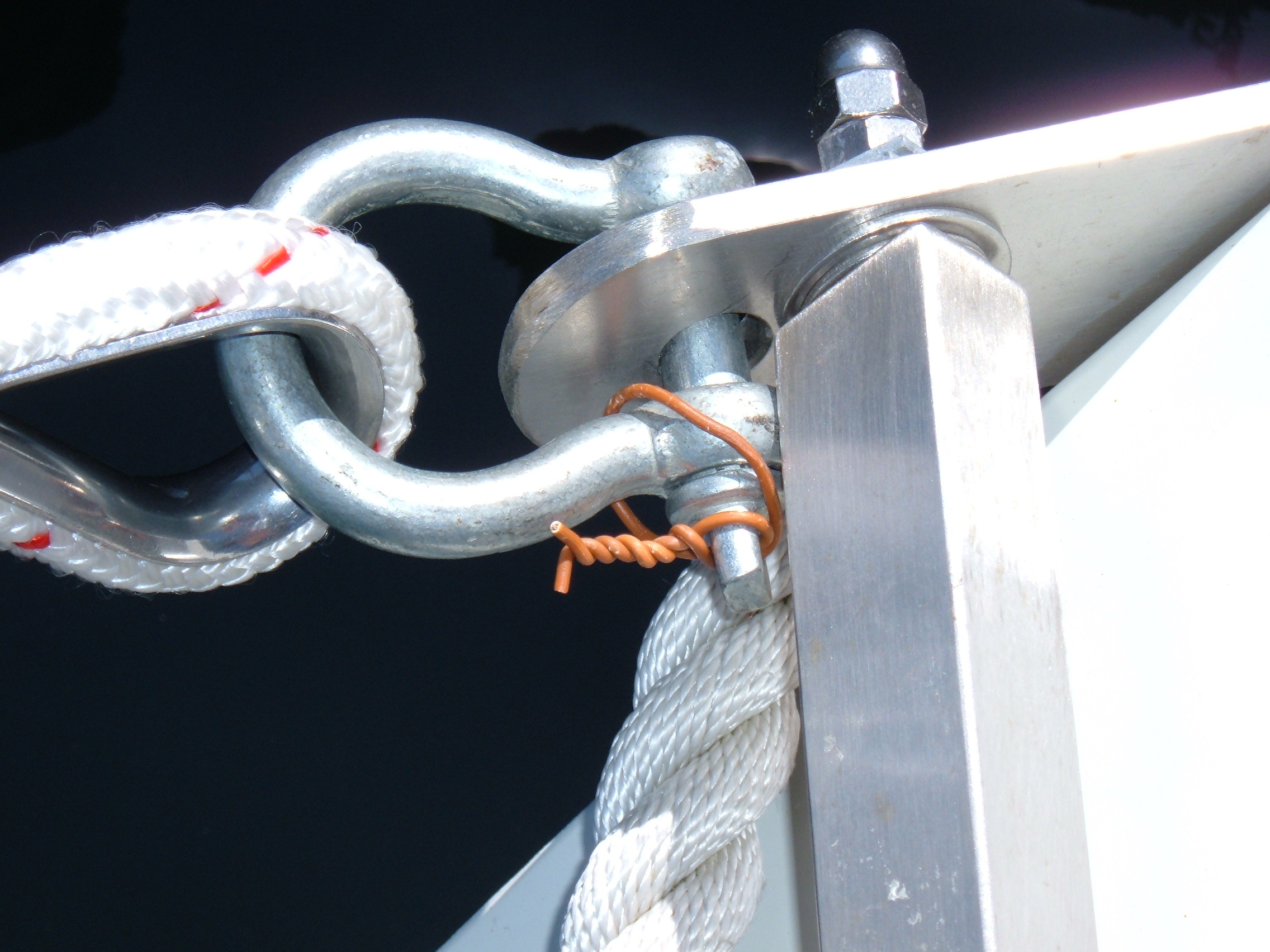 To better hold the boat against the oncoming waves and to halve the tensile forces on the boat's fastenings, a "rein" consisting of two lines forming a "V" is sheared between the stern fastenings and the hawser.